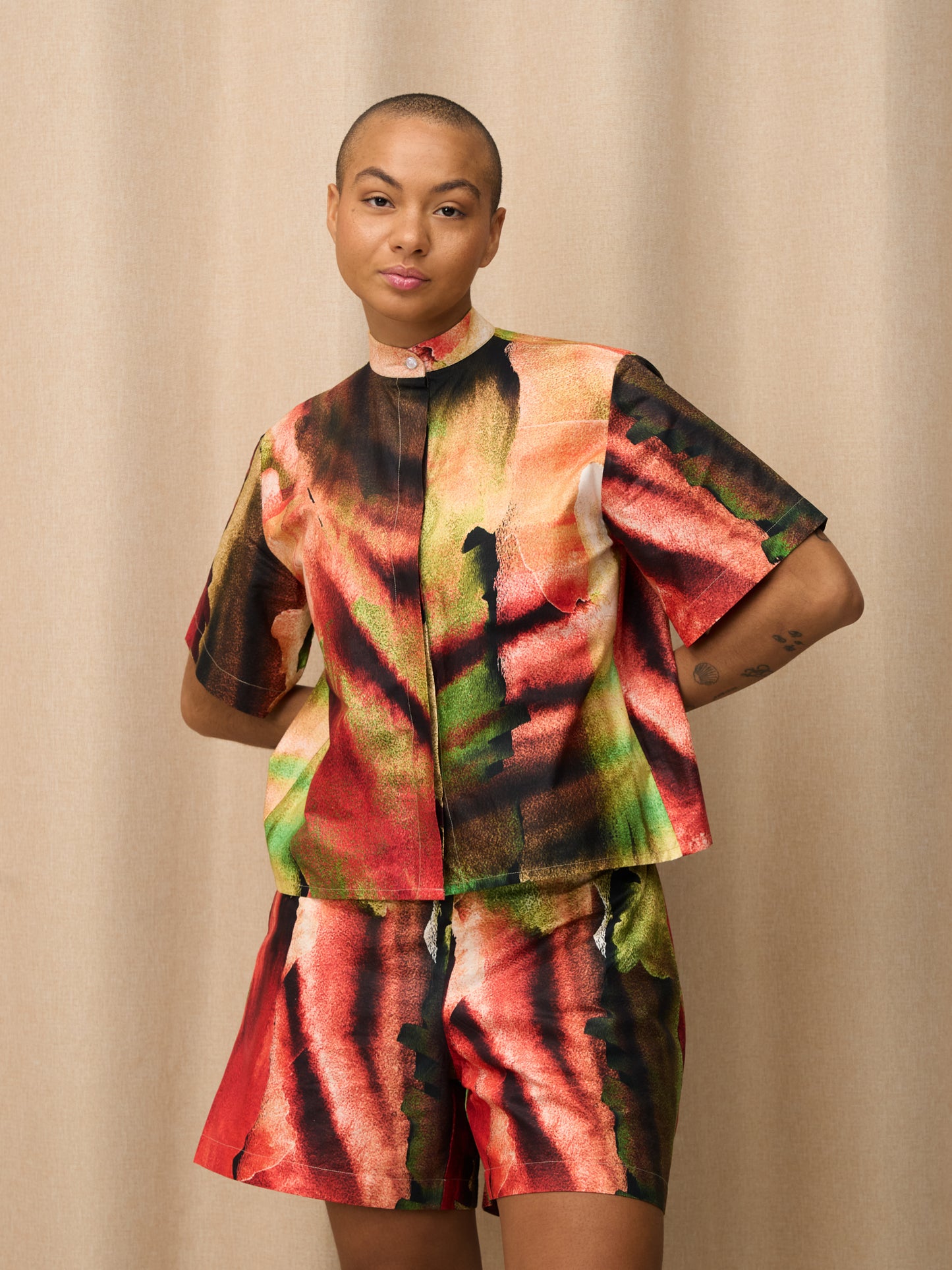 100% coton, imprimé et fabriqué en Côte d'Ivoire. Cette collection incarne l'engagement de Zoa pour la valorisation du savoir-faire.